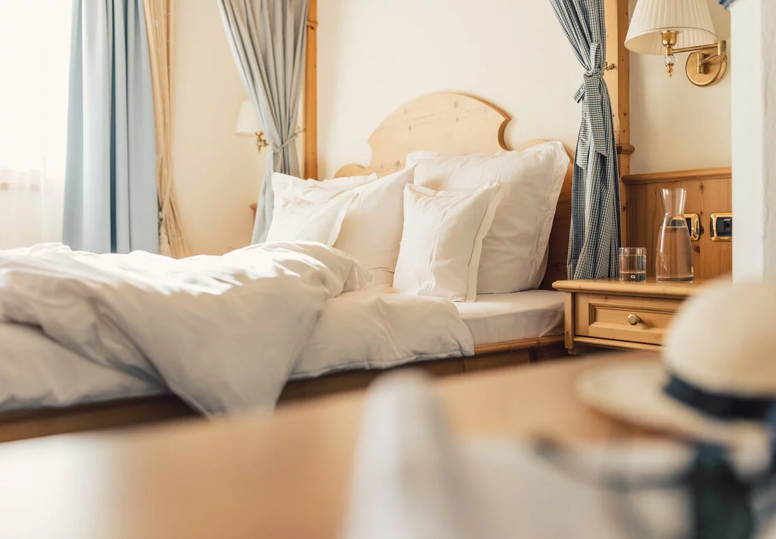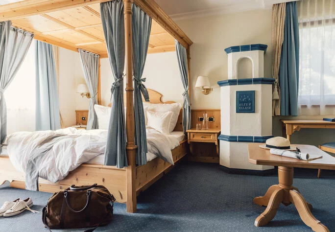 30 m² - Mit einer Größe von 30 m² bieten unsere Doppelzimmer Romantik gemütlichen Komfort und ein ganz besonderes Flair für Verliebte. Der wohlig-warme Kachelofen und das verträumte Himmelbett verleiten zu romantischen Stunden. Alle Doppelzimmer der Kategorie Romantik haben einen Balkon mit herrlicher Alpenpanorama-Sicht und befinden sich in der 1. oder 2. Etage. Bad: Massagedusche, getrenntes WC, Bidet.