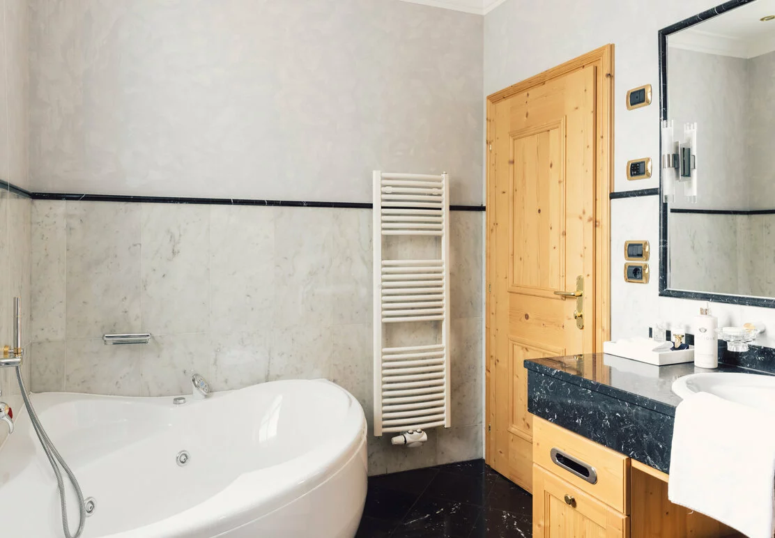 75 m² - Die Suite Jardin ist eine exklusive Dreiraumsuite mit einer Größe von 75 m². In ihr und um sie ist alles auf natürliche Entspannung und Regeneration ausgerichtet. Altholz Natur, die cremefarbigen Stoffe, der behagliche Kachelofen, der sonnige Wintergarten mit Gartenterrasse und das separate Zimmer bieten Ihnen einen besonders komfortablen Aufenthalt. Die Suite Jardin befindet sich im Erdgeschoss, zu ihr gehört ein wunderschöner Privatgarten mit Blick in den Park und die Ahrntaler Bergwelt. Bad: Dusche, Whirlpool, getr. WC, Bidet.
