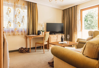 45 m² - Die Suiten Premier sind Zweiraumsuiten und sind mit einer angenehmen Größe von 45 m² eine perfekte Kombination aus Schönheit, Eleganz und Komfort. Gelb/Oliv, Altholz patiniert und ein geschmackvoller Kachelofen verwöhnen das Auge und lassen es warm werden um’s Herz. Alle Suiten Premier haben einen Balkon mit herrlicher Alpenpanorama-Sicht und befinden sich in der 1. Etage. Bad: Dusche, Whirlpool, Bad-TV, WC, Bidet.