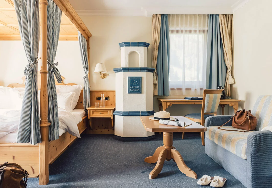30 m² - Mit einer Größe von 30 m² bieten unsere Doppelzimmer Romantik gemütlichen Komfort und ein ganz besonderes Flair für Verliebte. Der wohlig-warme Kachelofen und das verträumte Himmelbett verleiten zu romantischen Stunden. Alle Doppelzimmer der Kategorie Romantik haben einen Balkon mit herrlicher Alpenpanorama-Sicht und befinden sich in der 1. oder 2. Etage. Bad: Massagedusche, getrenntes WC, Bidet.